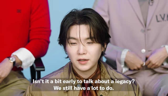 Instead of talking about the achievements they have already accomplished, SUGA responded modestly: “Isn’t it a bit early to talk about legacy? We still have a lot to do.” Jimin then continued the idea that BTS is still very young, saying: “We’re still young! With a bright future ahead!” — even though in reality they are K-pop superstars approaching their 13th debut anniversary and are already in their thirties, while some idols from the newest generations are only 14 or 15 years old.