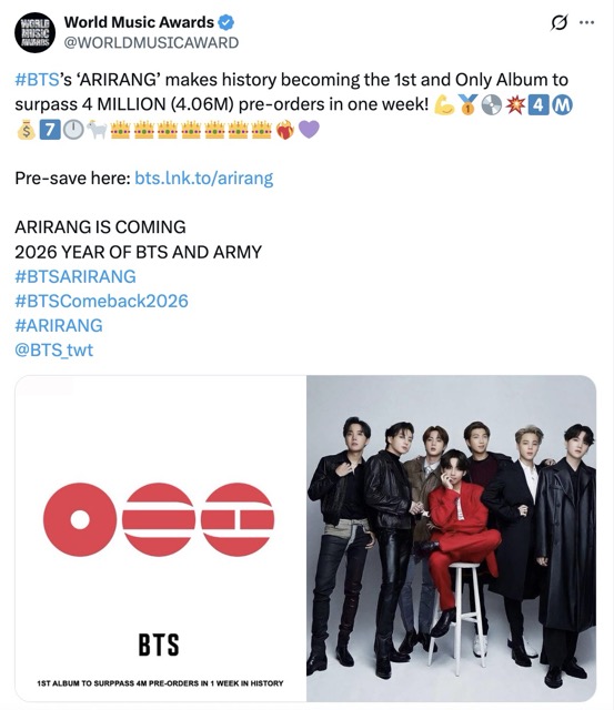 It appears that the printing industry is facing a crisis due to the sudden surge in production demand for pre-orders of the upcoming album ARIRANG, scheduled for release on March 20. On January 22, album distributor YG Plus confirmed that pre-orders for ARIRANG had surpαѕѕed 4 million copies within just one week since opening on January 16—the fastest in K-pop history. This figure is 640,000 copies higher than the previous record held by MAP OF THE SOUL: 7, which recorded 3.42 million pre-orders in the same time frame in 2020.