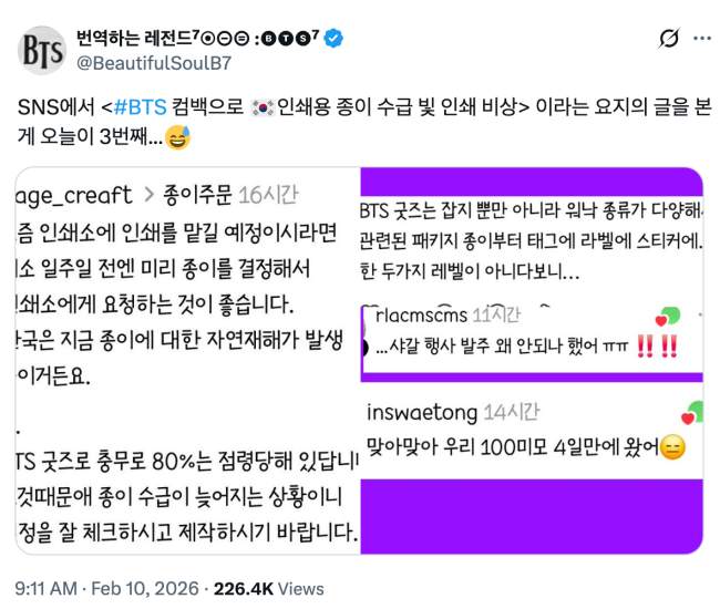 Specifically, a post circulating on social media compiled multiple posts from a кσяєαn online forum, mainly discussing an “Emergency in paper supply and printing industry due to #BTS comeback.” The post emphasized that this situation is real and ongoing, not just a joke among fans.
