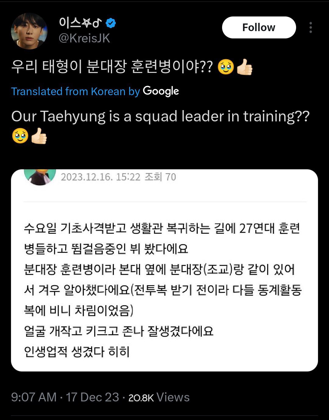 This news comes from a post shared by a platoon leader at the same Nonsan Training Center as V. Initially, this platoon leader's original post gained attention because he described the moment he encountered V running back to the dormitory after his first basic sho0ting training. He said "His face is really small, tall and super handsome. It was a life achievement of mine. Hihihihihi".