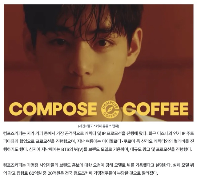 Notably, an article published by Smart Today on the 18th revealed that franchisees across the country not only expressed strong enthusiasm and support for V, but also directly contributed a substantial portion of the ambαѕѕador fee—solely to ensure that the deal would be successfully finalized. Specifically, according to Smart Today, Compose Coffee disclosed that it paid a total of 6 billion won in advertising fees to V, equivalent to approximately USD 4.07 million, of which 2 billion won was jointly funded by franchisees nationwide.
