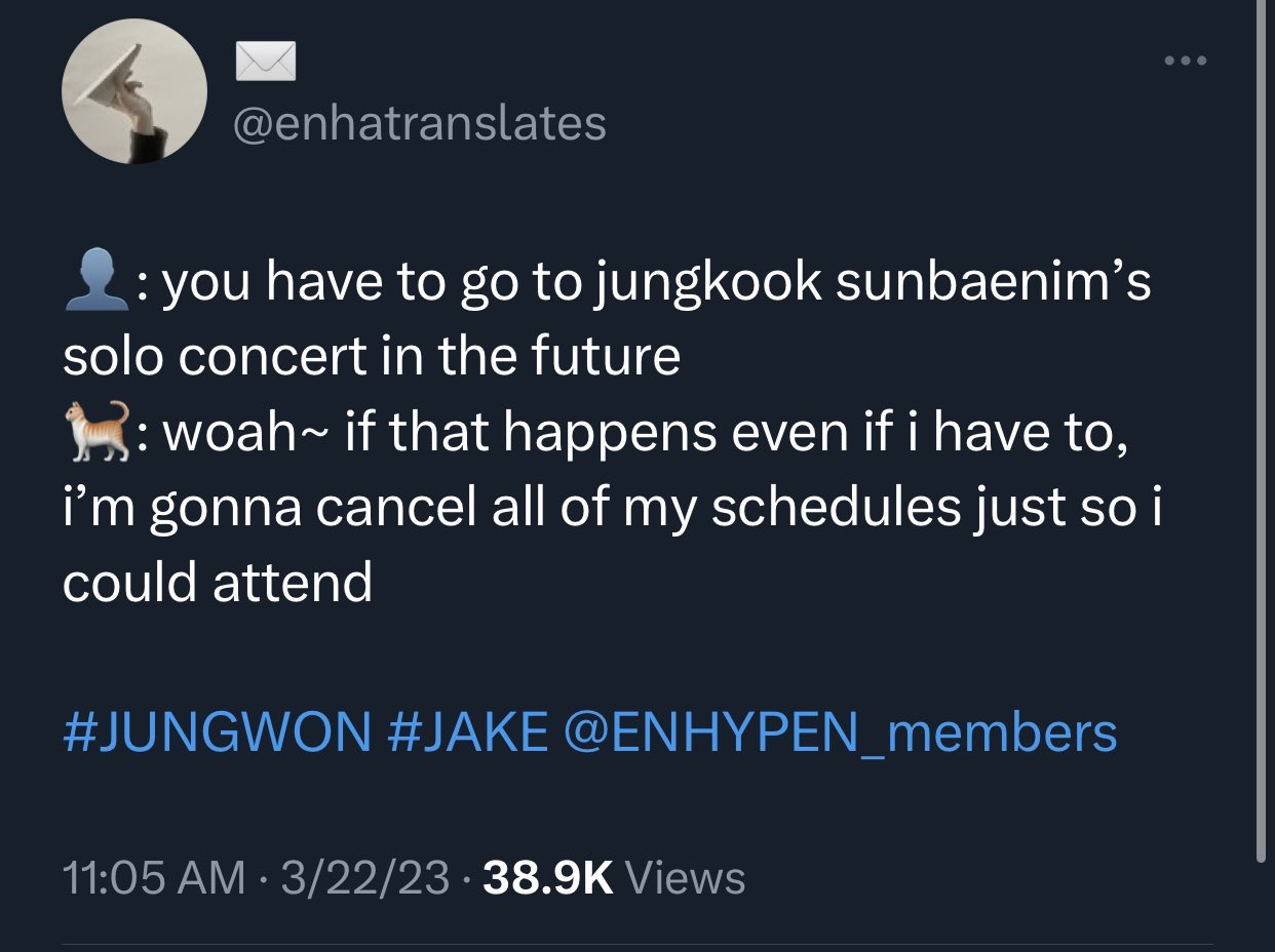 Fans wrote: "You have to go to Jungkook sunbaenim’s solo concert in the future". Then, Jungwon immediately gave his answer without hesitation. He wrote: "Woah~ if that happens even if I have to, I’m gonna cancel all of my schedules just so I could attend".