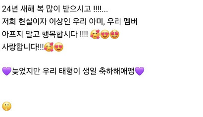 Anyway, Year 23 too I definitely endured and moved due to you guys. It's a little sudden/υиєχρє¢тє∂ but I still want to express it...Receive a lot of blessings for Year 24 (happy new year)!!!!!...And our reality and ideal, our ARMY, our members. Let's not be sick/нυят and be happy!!!! I love you!!! It's late but our Taehyungie happy birthdayyy". (The translation from @BTStranslation_ on Twitter).