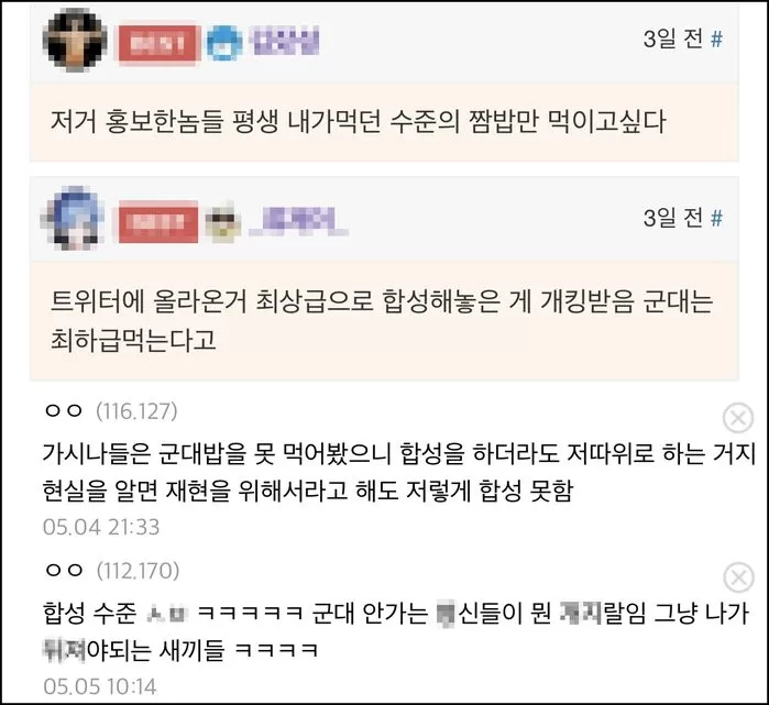 They think that the pictures of the m̷i̷l̷i̷t̷a̷r̷y̷ meal posted on SNS do not reflect the truth and are angry about it. These people even ask the account holder to reflect honestly while netizens have mixed reactions on the matter: