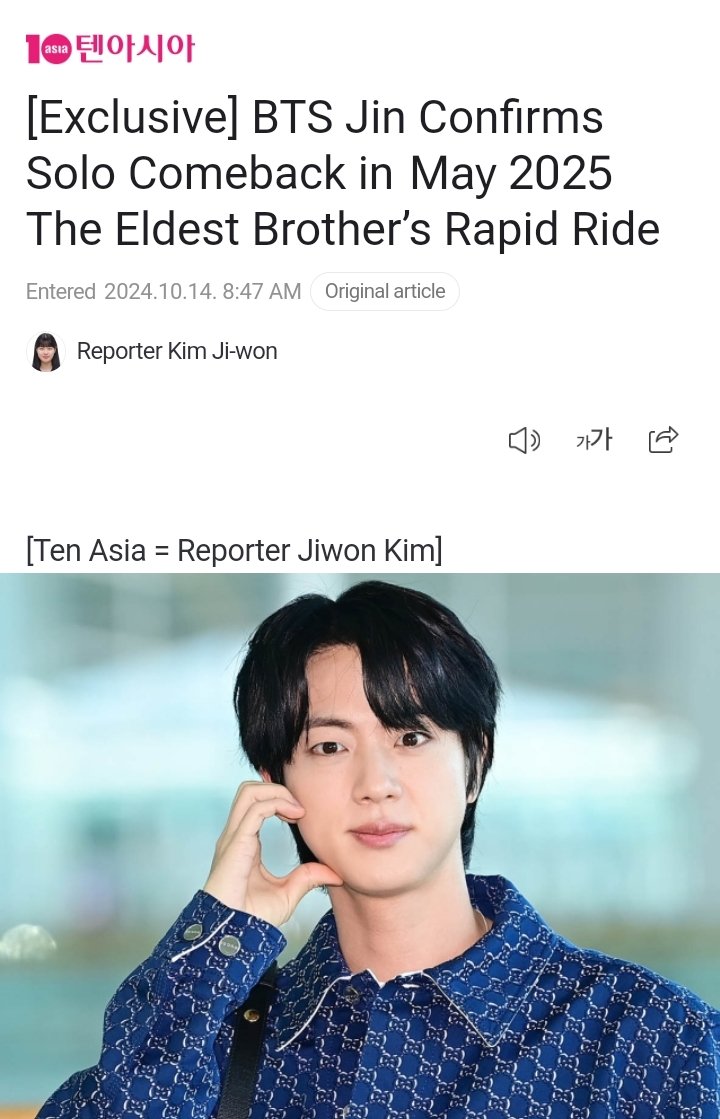 A few hours ago, a post on SNS attracted great attention from fans with the title "[EXCLUSIVE] Kmedia reports Jin has confirmed his solo comeback in May 2025. Following the release of “Happy” on the 15th November, Jin is once again preparing for an extraordinary music journey." Along with that, a link to the largest portal in кσяєα was attached.