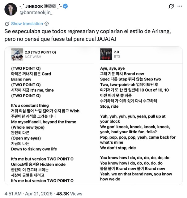 Specifically, the track “2.0 (TWO POINT O)” from NCT WISH’s new album has been pointed out by many fans for its noticeable similarities to “2.0” from BTS’s ARIRANG. A clear common point is that both songs carry a modern sound with hip-hop elements as their foundation. Notably, when comparing the lyrics side by side, some fans have also highlighted similarities in the distribution of кσяєαn and English lines, as well as the use of closely related words.