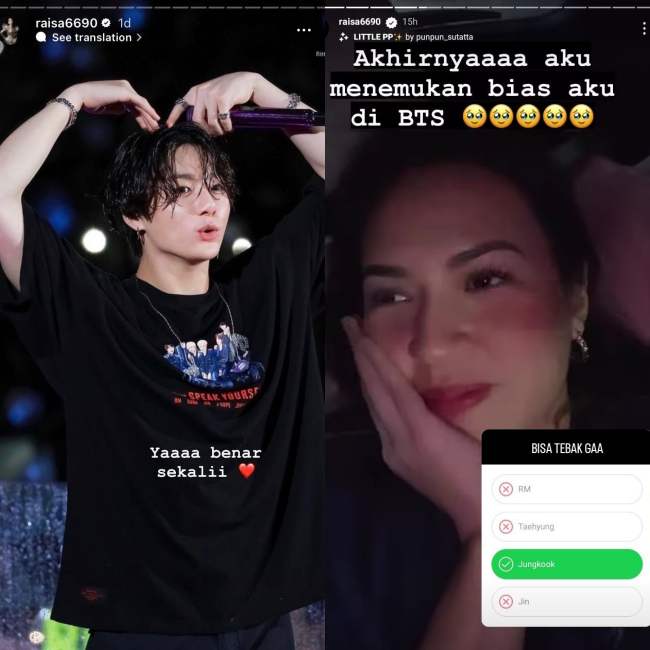 This is not the first time Raisa has spoken about this topic. Previously, during a Q&A session with fans on Instagram, she had already revealed that Jungkook is her bias. Euphoria also appears to be her favorite Jungkook song, as she often uses it as background music for her Instagram stories. On another occasion, while reacting to AI cover content of her songs, she said, “Why don't you make my version featuring Jungkook, anyway?”