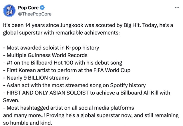 On April 25, 2025, X account @TheePopCore shared that today is the 14th anniversary since Big Hit Entertainment discovered the Golden Maknae with a long list of remarkable achievements over the past 14 years, celebrating this memorable anniversary.