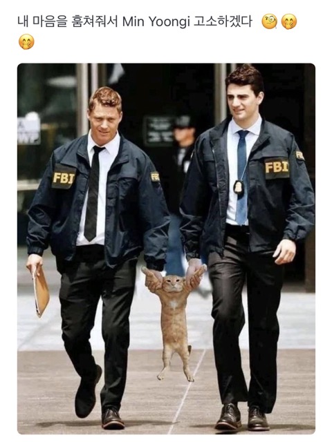 While the wave of excitement surrounding Seoltang still hasn’t ∂ιєd down, fans have recently brought back attention to an older but fascinating post related to the topic of SUGA and cats. It was a Weverse post from 2022 by a fan with the caption: “Suing Min Yoongi because he stole my heart”. The post included a meme photo of a cat with a “not having it” expression, being lifted up by two ρσℓι¢є officers as if it were being escorted like a criminal.