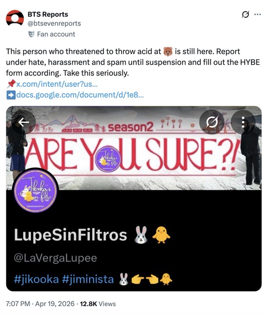 As soon as the news spread, ARMY began tagging official HYBE accounts in posts, urging the company to take the situation seriously and strengthen security measures for their artists. Fans also encouraged others to report the accounts allegedly behind these harmful plans. They have been collecting screenshots and evidence to submit through HYBE’s online reporting portal, protect.hybecorp.com, to flag the accounts and individuals involved.