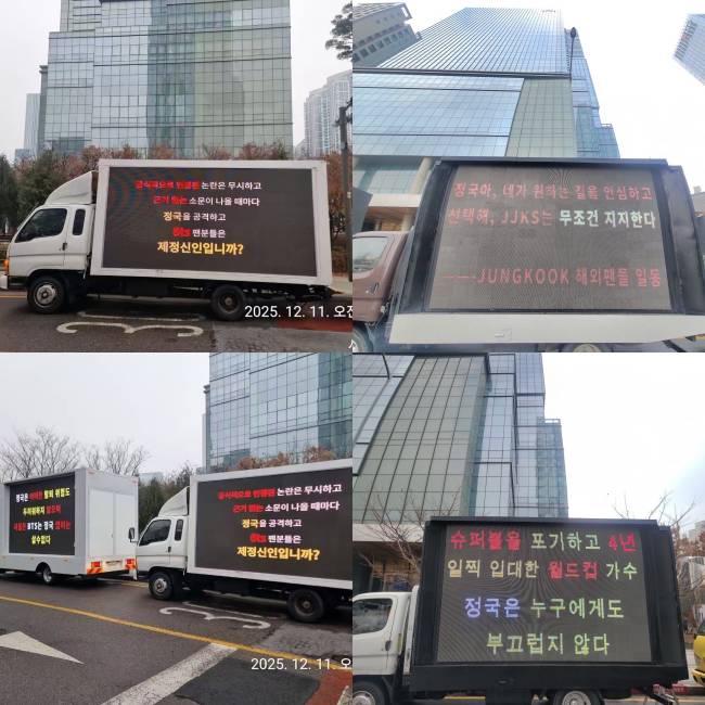 Regardless of who was responsible, genuine ARMYs emphasized that these messages do not represent the fandom and never have. Realizing that explanations would be ineffective just by words — and fearing that Jungkook or the BTS members might see the trucks and misunderstand the fandom’s intentions — ARMYs swiftly mobilized seven support trucks to surround HYBE’s headquarters, directly facing off against the protest trucks.