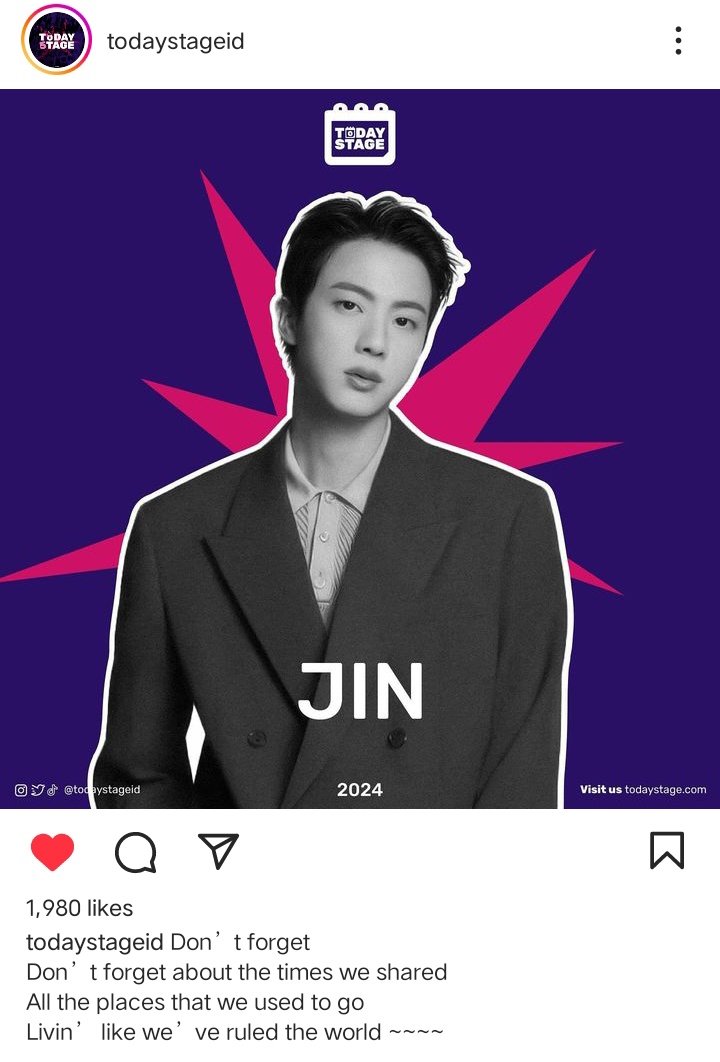 Most recently, ARMYs are even excited about the rumors that Jin might soon hold a concert in Indonesia after Today Stage "teased". For fans who don't know, Today Stage is an Indonesian account that shares information and news about Kpop concerts.