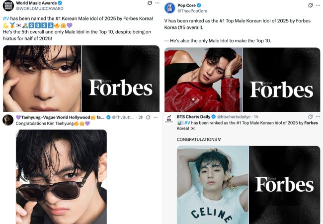 On Monday, December 1, Forbes кσяєα officially announced the Top 30 Korean Idols of 2025. Notably, among the top 10 male idols, five BTS members—V, Jungkook, Jin, Jimin, and j-hope—secured spots. V topped the rankings, becoming the No.1 Male K-pop Idol of the Year.