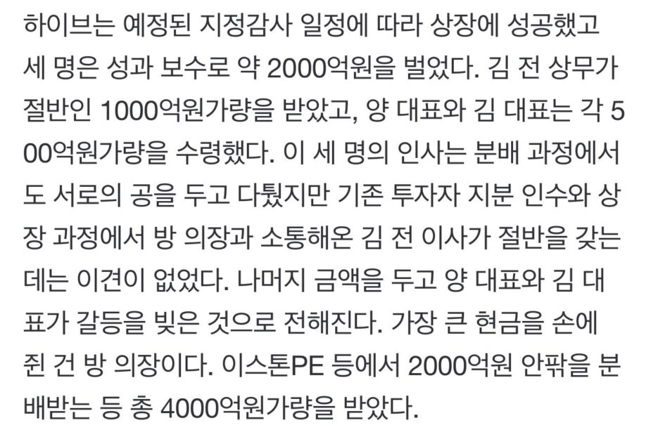 The remaining amount distributed between the two CEOs, Yang and Kim, reportedly caused internal conflict. The one who ended up with the largest cash payout was Chairman Bang, who reportedly received a total of around 400 billion KRW, including a 200 billion KRW lump-sum payment from Eastone PE and others.”