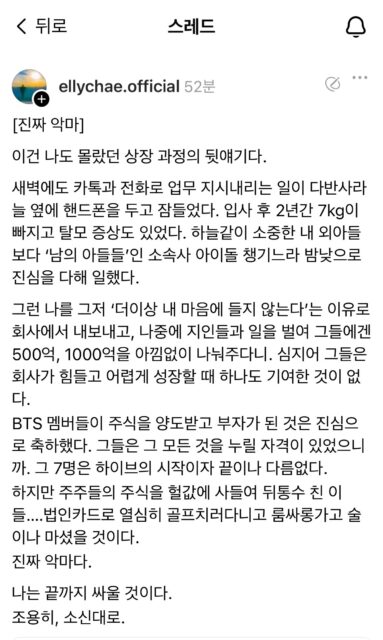 Amid the troubles plaguing HYBE, a former employee has revealed some truths about the company that she experienced during her previous employment. On June 7, poster Elly Chae Eun, who claims to be the former communications director of Big Hit Music and was fired in 2017, shared a post on Threads.