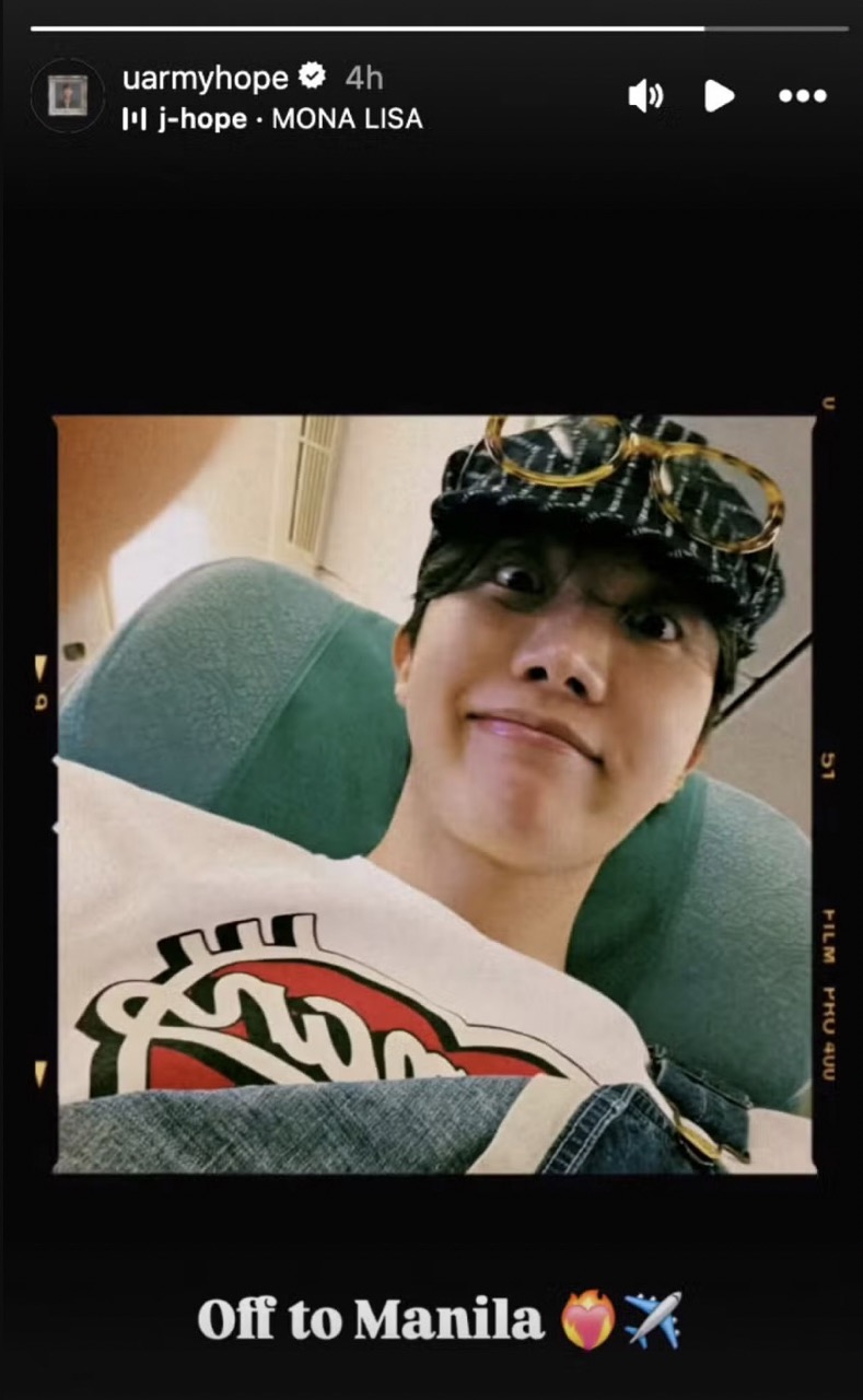 j-hope also did not hesitate to share about his schedule when posting a photo on the plane with the caption: "Off to Manila" as seen on his Instagram Stories.