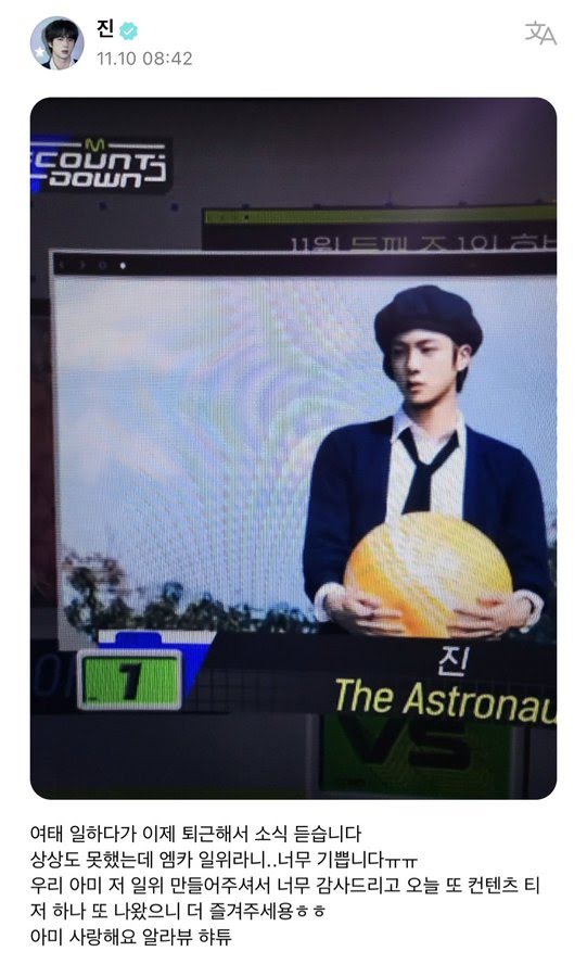 At the time of this achievement, only Jin shared and thanked his fans. He wrote on Weverse that: "I was working until now and just got off work so I heard about the news late. I didnt even imagine it [would happen]. To say that [I won] 1st place on M Countdown, I’m so happyㅠㅠ. Thank you to our ARMYs for making me [win] 1st and, since another content teaser came out today, please enjoy it more heh heh. ARMY, I love you. I love you heart (aegyo)."