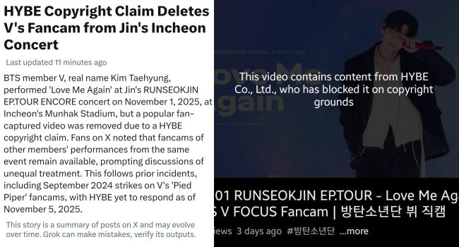 As one of the best sources for high‑quality V videos with many years of fancam experience, ARMYs were ѕнσ¢кed when the fancam capturing V’s most recent performance at Jin’s Incheon encore concert—“Love Me Again”—was taken down due to a HYBE copyright notice just three days after upload. What outraged fans most was that other fancams remained unaffected while HYBE suddenly targeted this particular V fancam.