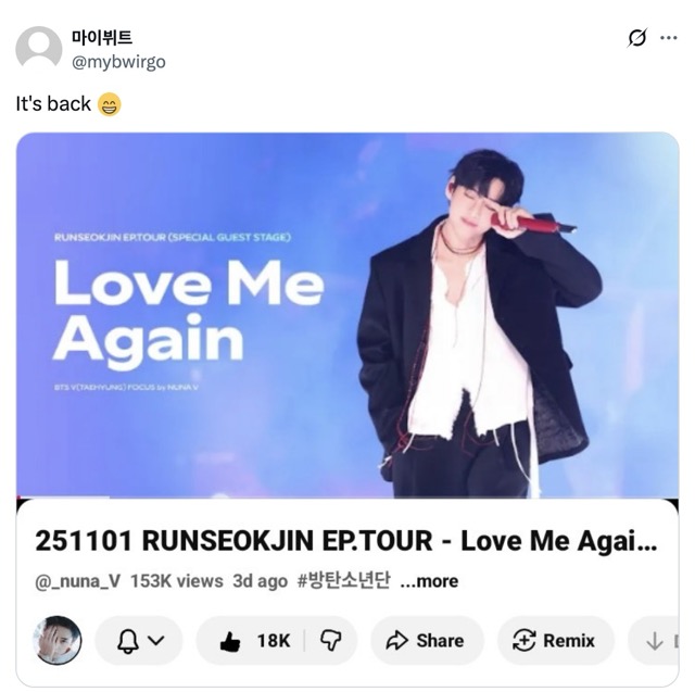 “Love Me Again” is one of the rare stage performances fans have been able to see in the past three years since V enlisted. That is why ARMYs treasure NUNA V’s fancam so much. They celebrated the fancam’s reactivation with comments like: