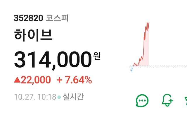 Specifically, as reports about BTS’s reunion gained momentum, HYBE’s shares surged by 9.03% (26,000 KRW) as of 10:18 a.m., reaching 314,000 KRW per share, compared to the previous trading day. According to Mirae Asset Securities, among investors in the top 1% for investment returns over the past month, HYBE was the most-purchased stock as of 11 a.m. that day.