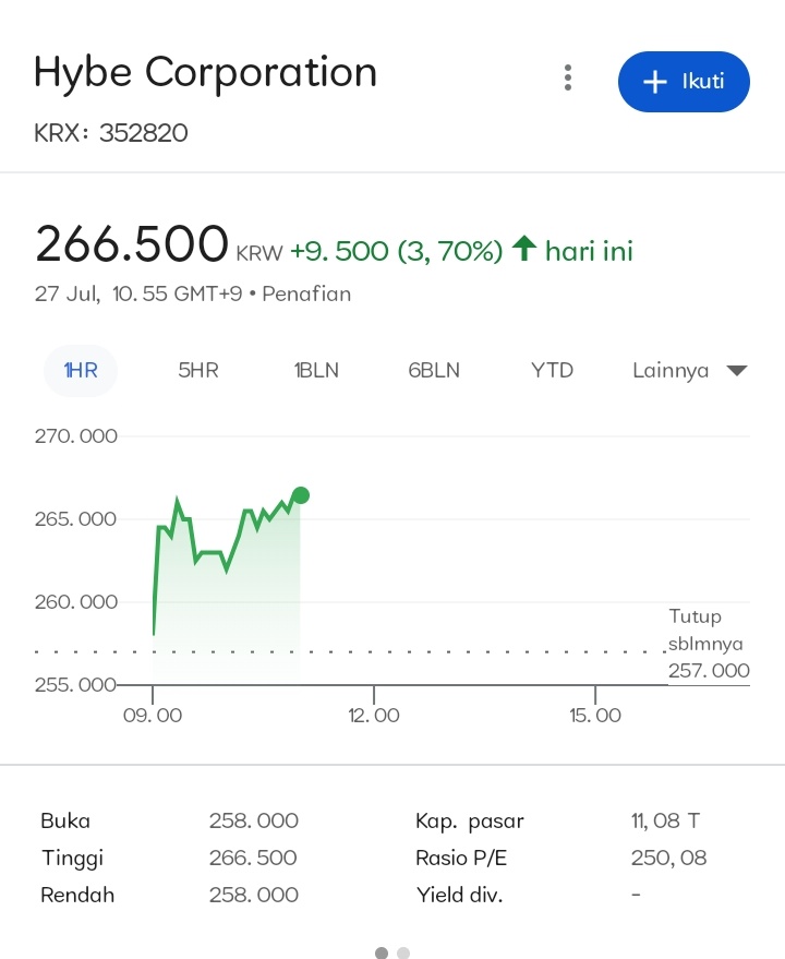 Along with this, the stock value of HYBE has seen a sharp increase again after Jin increased his popularity. At the closing session on the afternoon of July 27, HYBE's stock value reaches 266,500 won, increasing 3,70%, compared to the previous day.