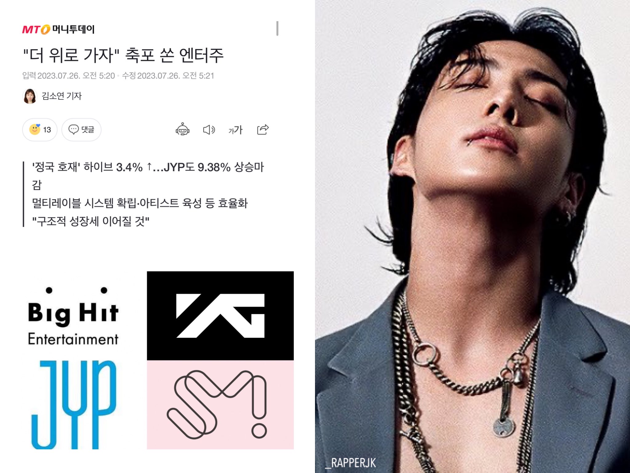 Specifically, on July 25, HYBE - the company directly benefiting from Jungkook's achievements recorded at 277,000 won, an increase of 9,000 won (3.44%) compared to the previous day. JYP Entertainment. recorded 141,100 won, up 12,100 won (9.38%), showing the highest profit margin among the 4 entertainment companies. SM increased by 7% and YG Entertainment increased by 6%.