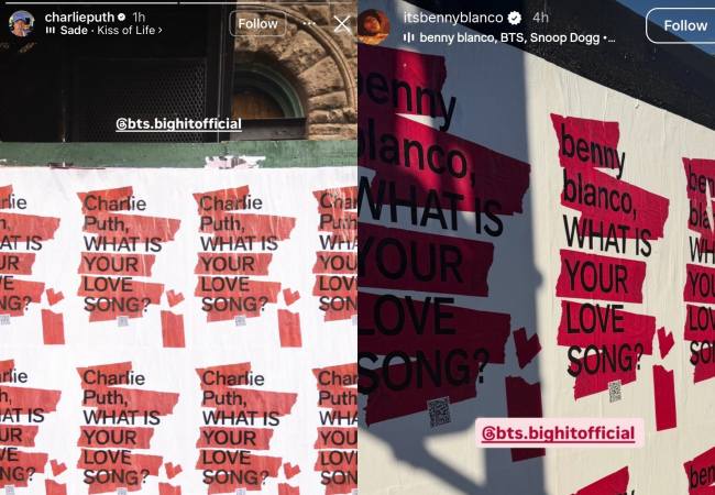 Notably, on February 21, fans were surprised to discover that two prominent names had shared posters featuring their names on the signature red tape background via Instagram Stories: Benny Blanco and Charlie Puth. While Benny attached the BTS x Snoop Dogg collaboration track “Bad Decisions,” Charlie shared “SADE” by Kiss Of Life.