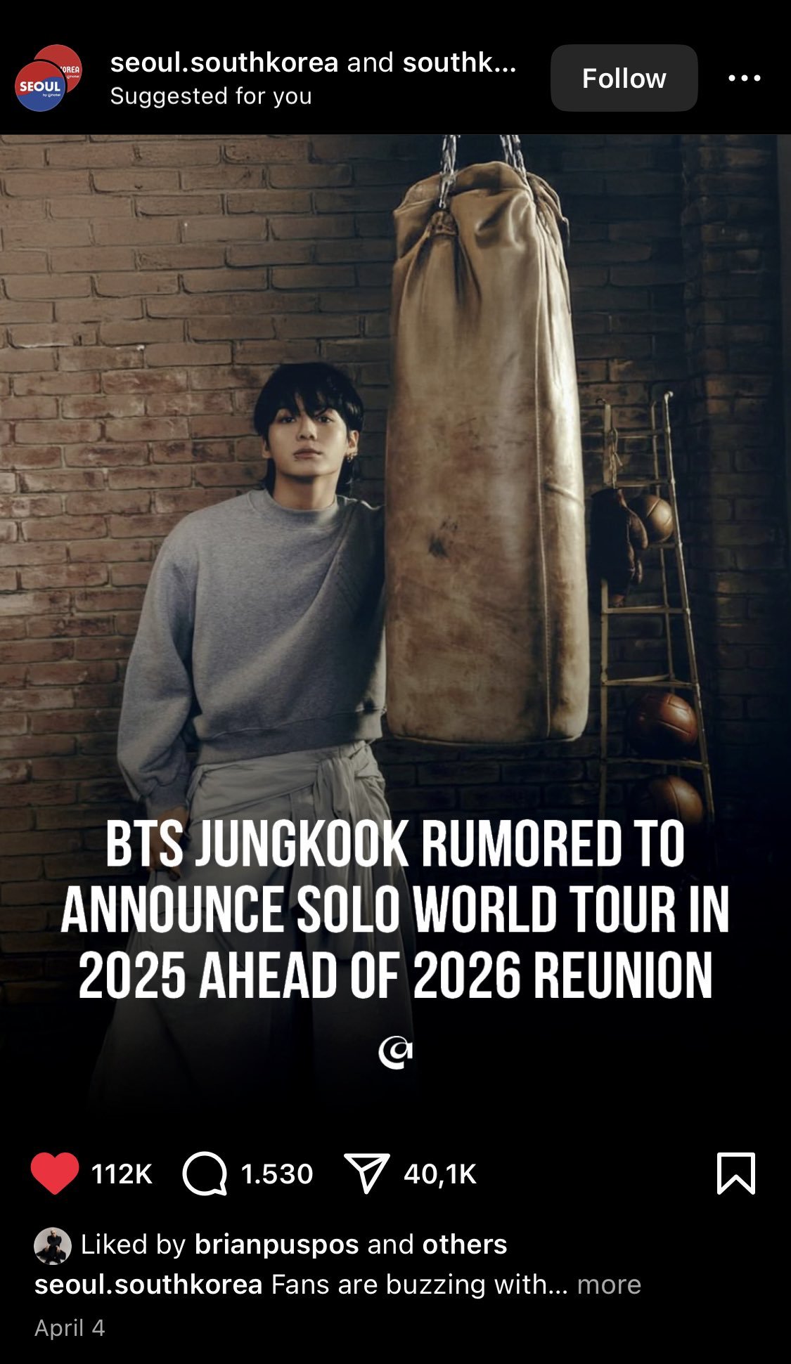 The dancer liked an Instagram post about Jungkook's world tour in 2025. He also announced that he and the rest of Seven will continue to work with Jungkook in 2025, promising a comeback soon for the special event.