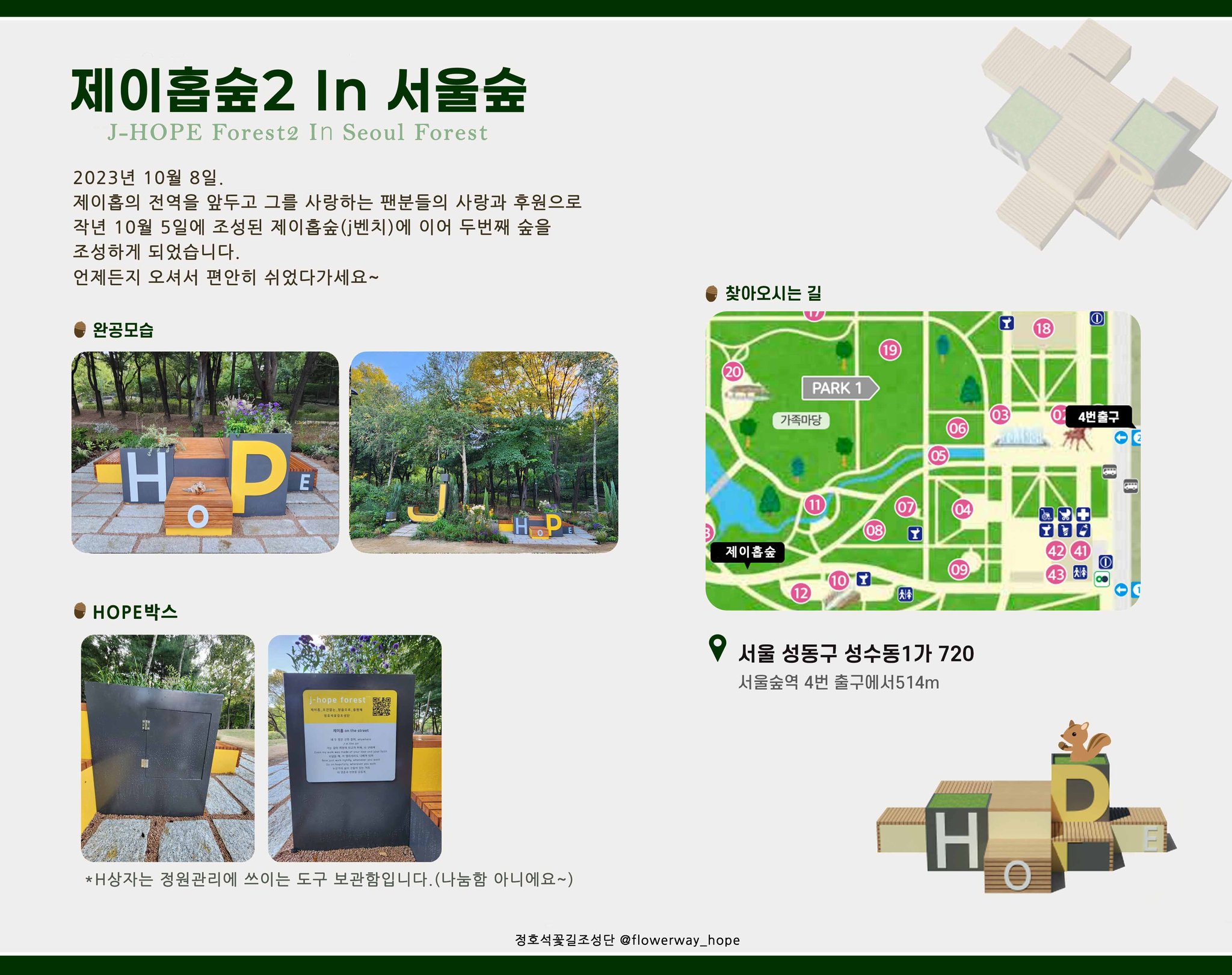 The success and popularity of the J-Hope Forest among both local citizens and international visitors inspired the fan group to expand their efforts last month. In celebration of J-Hope’s discharge, they established “J-Hope Forest 2” near the original garden as a tribute to his return.