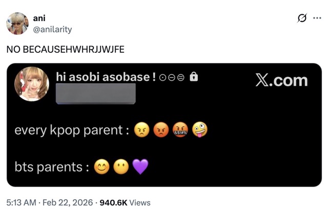 This has recently sparked a viral discussion on Twitter comparing BTS’s families with some negative cases involving other idols’ parents. The post garnered nearly one million engagements, with comments in agreement such as: “13 years and no drama whatsoever from all 14 of them yet everyone else wants to open their pie-hole for some bullsh1tttt… give the tannie parents medals” and “No member drama, no family drama, BARELY any relationship drama… only mentally ill antis on the internet that can’t be normal about them.”