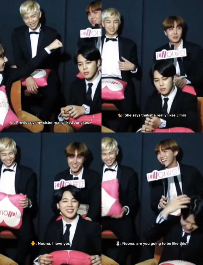 Building on Jiwoo’s fondness for Jimin, j-hope added more reasons why he would choose Jimin to introduce to his sister, describing him as “charismatic,” “kind,” and especially good at aegyo (cute gestures), which always makes his sister happy.