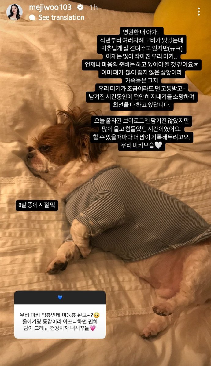 In the post, Jiwoo wrote: "My baby forever... There have been several critical moments since last year, but our Big Chu has endured them well . Still, our Mickey has become so much smaller now... I feel like we need to be prepared in our hearts. His lungs are already in very poor condition, so our family is simply hoping that Mickey suffers as little as possible... and we're doing our best, wishing that he can spend the time he has left in peace.