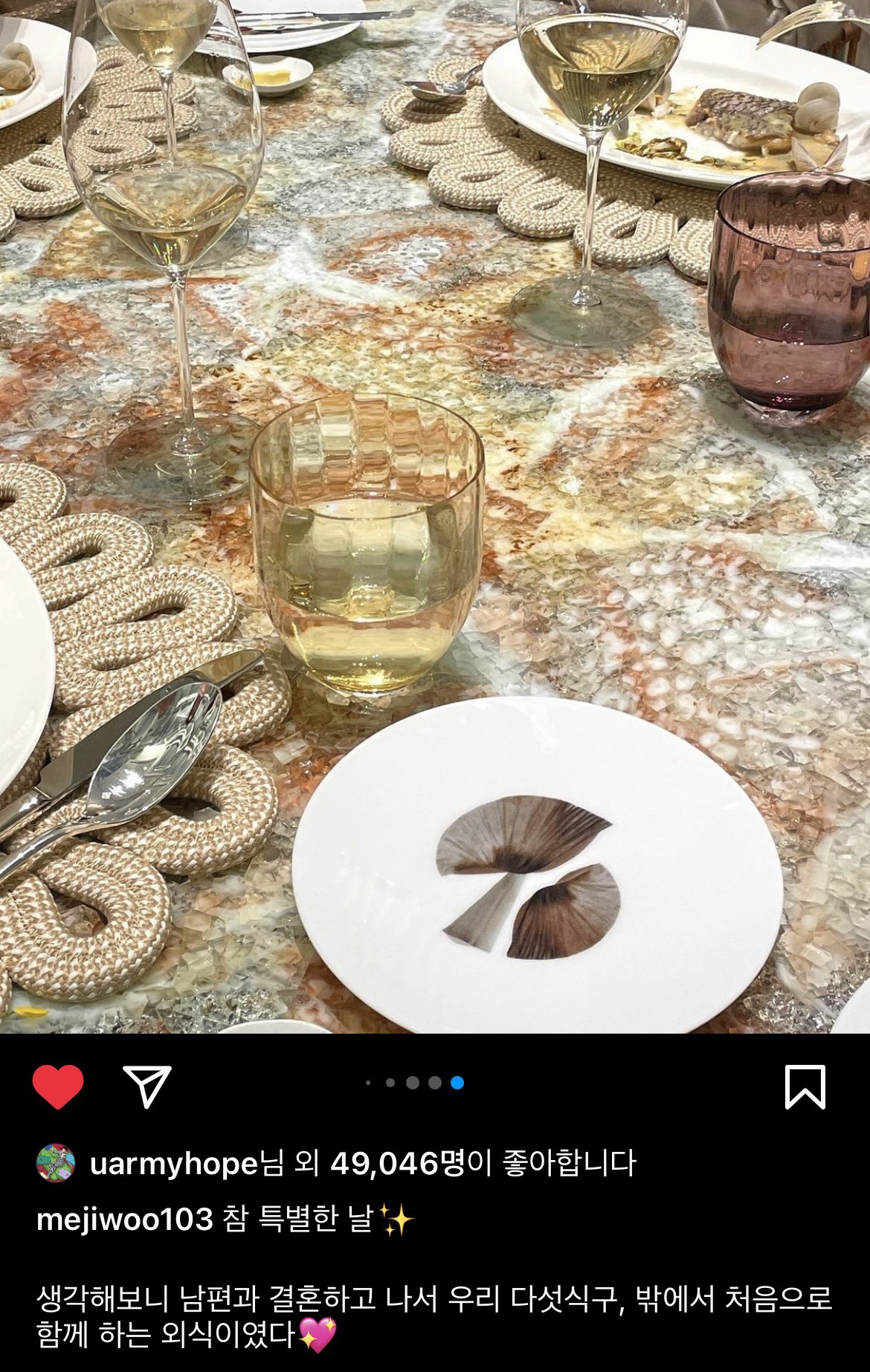 Jiwoo wrote, “A very special day. Looking back, it's true that this is the first time that 5 members went out to dinner together after my husband and I got married. Three hours have passed, I have spent the whole evening talking about the wonderful dishes in such a magnificent place, today is a day I will remember forever".