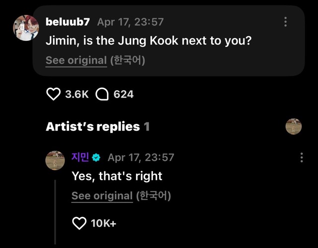 In particular, he also let fans know that Jungkook is by his side in a comment asking that: "Jimin, is Jungkook next to you?". For those who don't know, the duo is serving under the Buddy System, where they can serve in the same unit from December 2023.