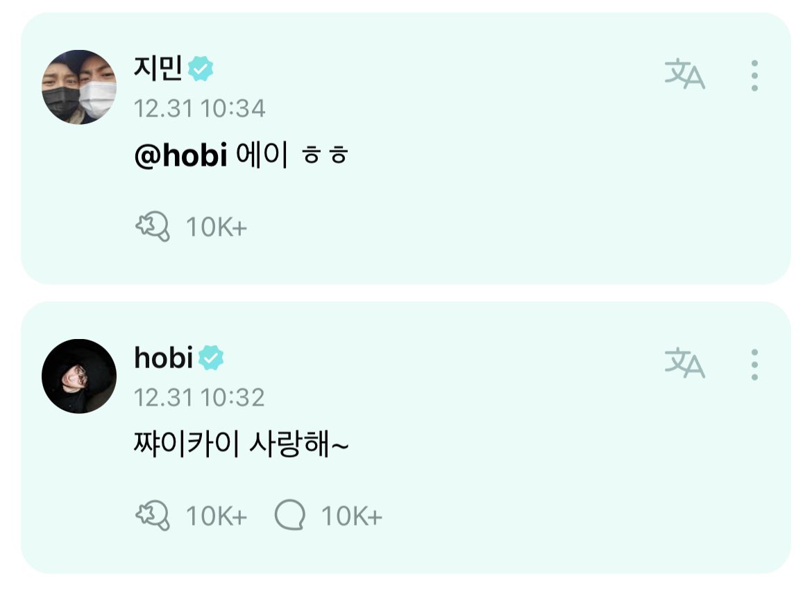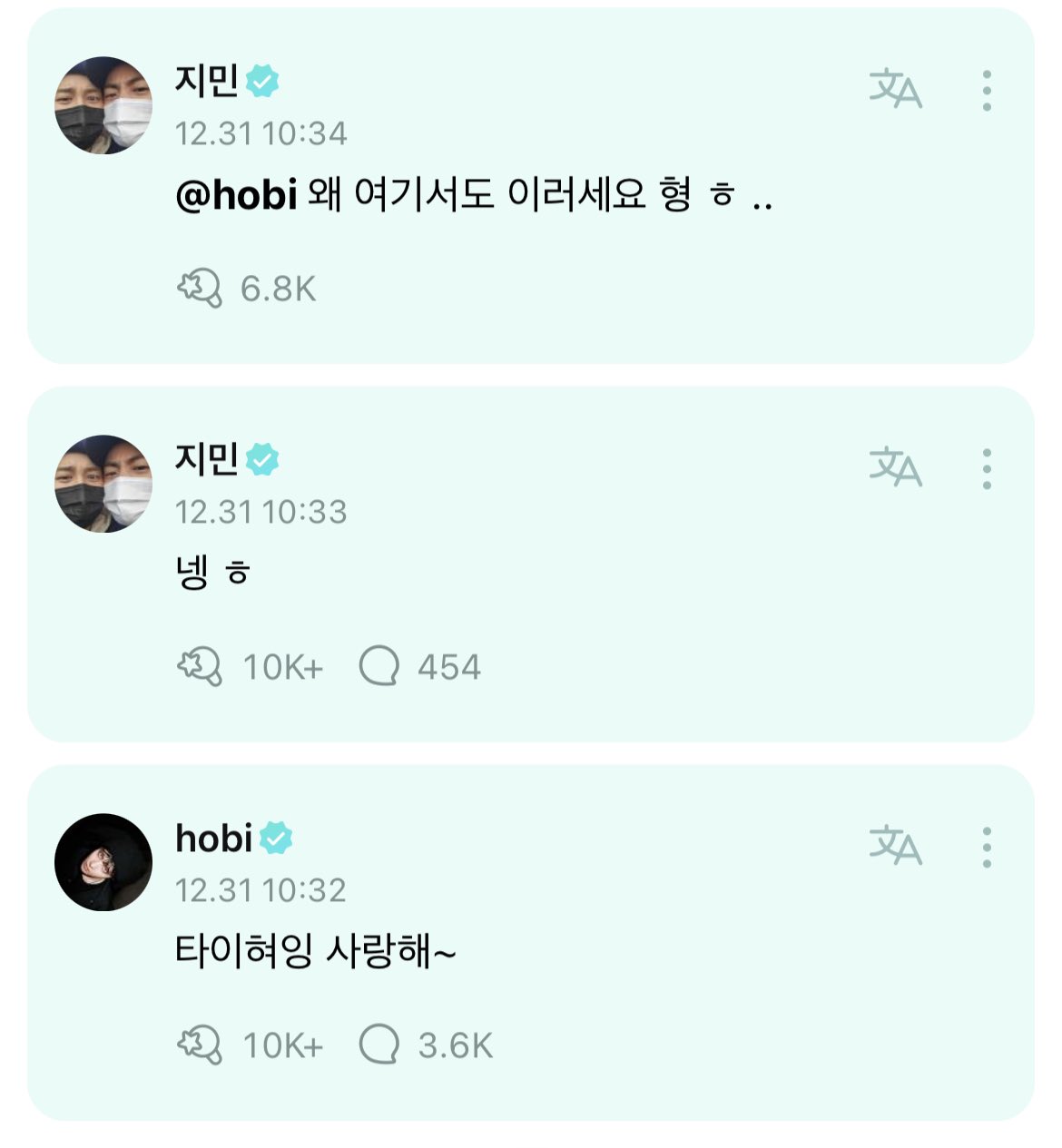 - For a second i thought it was hobi replying to jiminie and teasing by using hyungnim because he has Jin in his pfp. I felt my heart break it was too soon