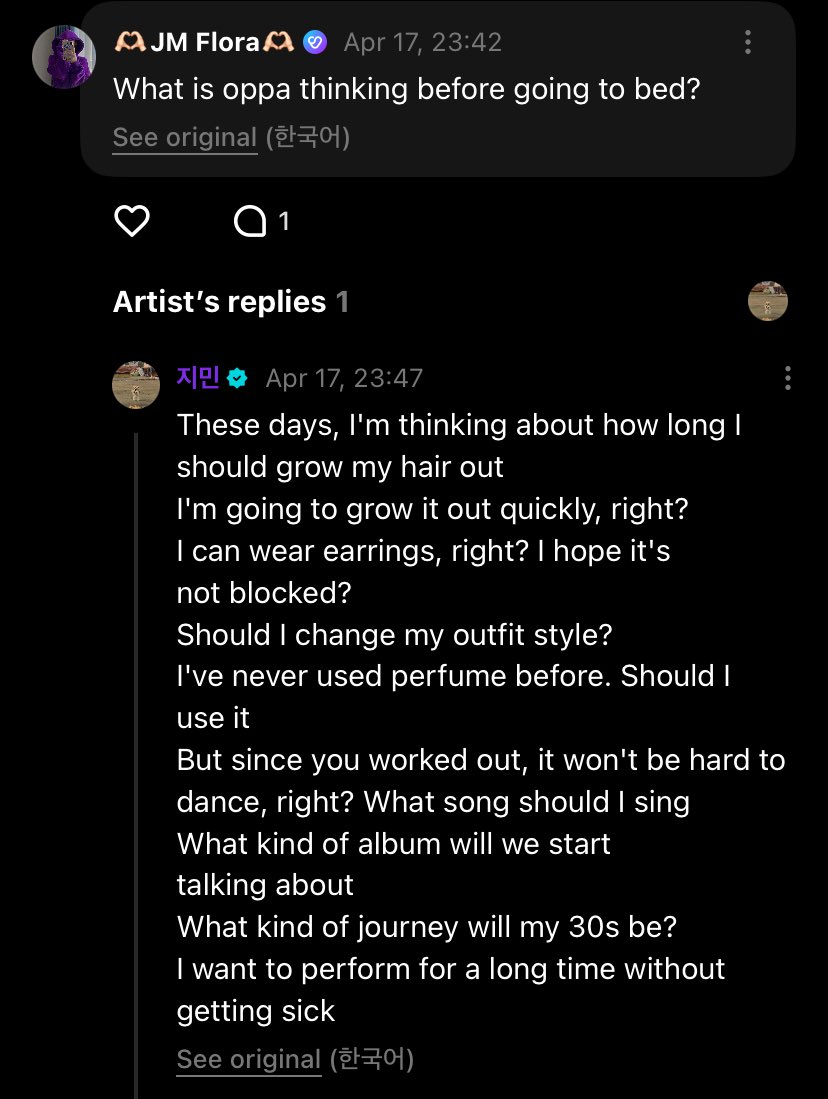 In another touching message, Jimin responded to a fan who shared how BTS helped her through a painful loss. He thanked her and said he was proud of her growth, adding that he hopes her future will be filled with happiness.