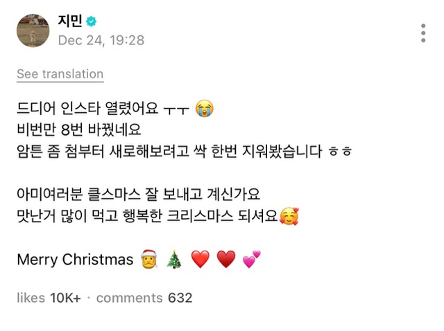 In a post shared on Weverse, Jimin mentioned a comical situation regarding his forgotten pαѕѕword and explained why he cleared his old posts: "Finally, my Instagram is open. I think I changed my pαѕѕword 8 times. Anyway, I wanted to start fresh from the beginning, so I tried deleting everything once. ARMY everyone, are you having a good Christmas? Eat lots of delicious food and have a happy Christmas. Merry Christmas."