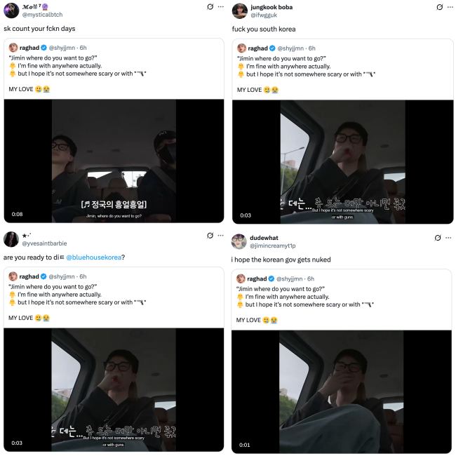 In one clip from the first episode, when asked where he wanted to go, Jimin replied that anywhere was fine but added, “I just hope it’s not somewhere scary or with guns.” This was not a throwaway joke—and anyone could recognize that the place he was alluding to was the military base.