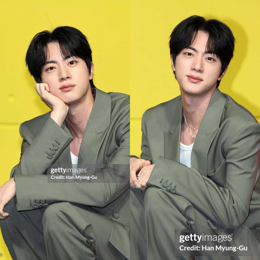 Jin's olive suit at this event was simple but elegant, completely highlighting his polished image. His dark hair was styled in a center part, adding to his refined, actor-like aura. The finishing touches — delicate silver necklaces — made him look even more effortlessly stylish.