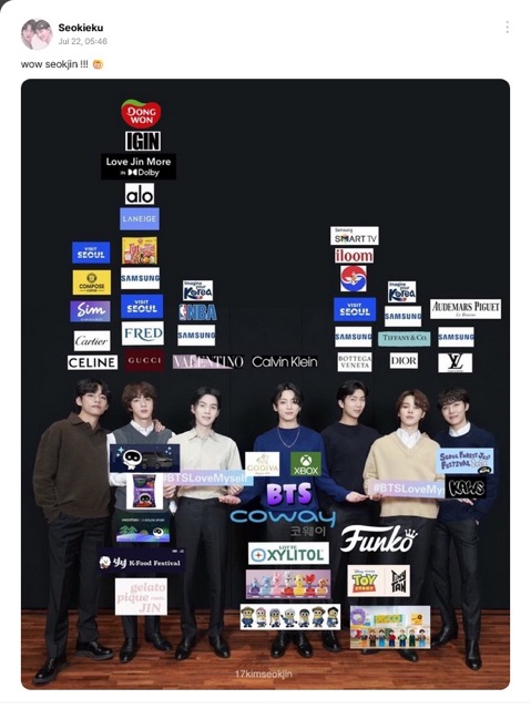 From high-end fashion like GUCCI, luxury jewelry brands like FRED, food products such as Ottogi Jin Ramen, cosmetics like LANEIGE, to sports and tourism brands like Alo Yoga and Visit Seoul — the name “Jin” now represents a versatile icon that goes beyond the limits of a typical music idol.