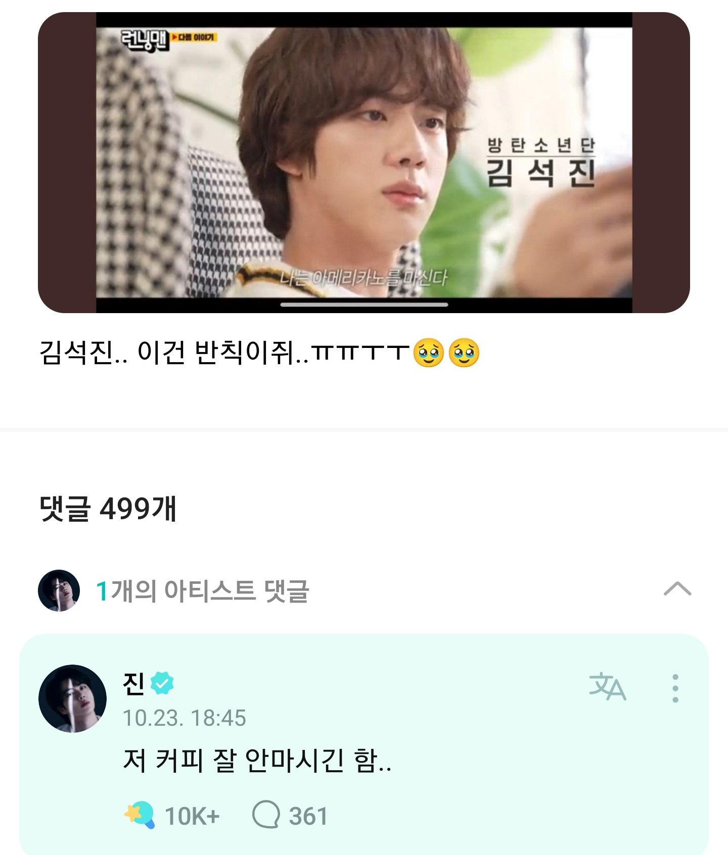 Jin then saw this ARMY's post and kindly revealed that he didn't actually drink the coffee as shown in the video. He said: "I don't really drink coffee.."