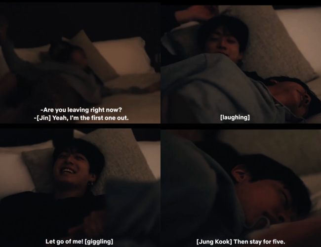 Another example comes from a clip taken from the recently released documentary BTS: The Return. Before Jin left the group’s creative camp in Los Angeles, he went over to Jungkook, hugged him while he was lying on the bed, and said he didn’t want to leave early. He even asked Jungkook to add his fingerprint or give him the pαѕѕword to the youngest’s villa, and offered the same for his own place—just so he could come over anytime.