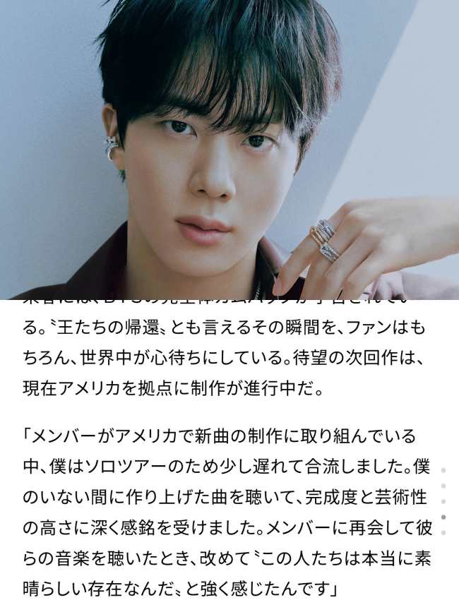 In the newly released interview between SPUR and Jin on the morning of November 21, the discussion inevitably touched on this major topic. SPUR referred to “BTS’ full-group comeback next spring” as “a moment that can be called ‘the return of the kings,’ anticipated not only by fans but by the entire world,” and asked Jin to “give a little hint.”