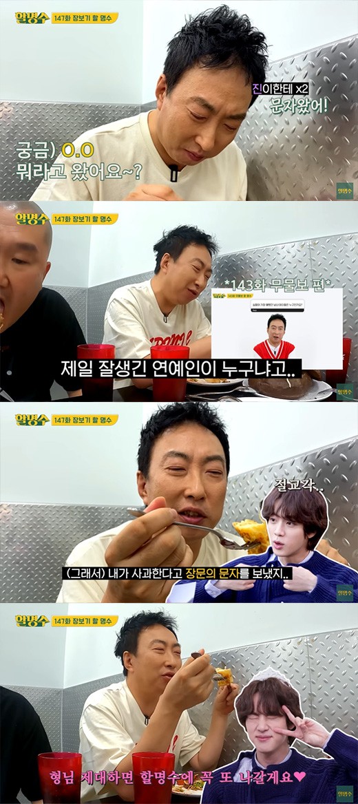 Later, Jin gave the reason for his disappointment that Park Myung-soo didn't choose him as the most handsome. Park Myung-soo recounted how Jin frankly "attacked" the comedian, saying, "I think he's sad because I didn't declare that he's the most handsome celebrity I've ever met face-to-face on 'Halmyeongsu' (ep 143)" and made everyone laugh at that amusing anecdote.