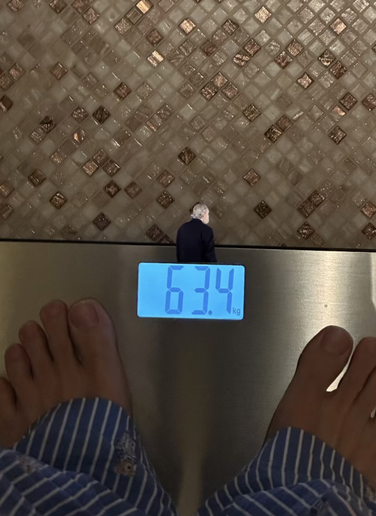 Today, V posted several photos including his body proportions and ant waist on Instagram. Including a photo of his current weight. His weight reached 63.4 kg. Compared to his height and other stats, V's ratio is almost in balance.
