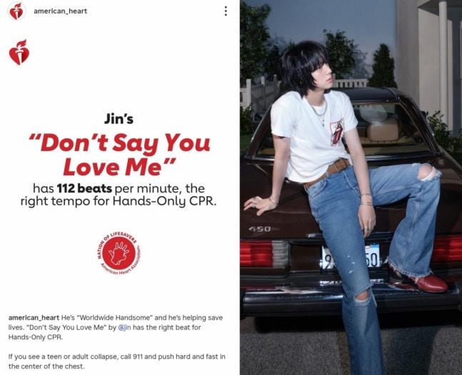 Specifically, on its official Instagram account with over 555,000 followers, the nonprofit organization posted: "He’s “Worldwide Handsome” and he’s helping save lives. “Don’t Say You Love Me” by @jin has the right beat for Hands-Only CPR. If you see a teen or adult collapse, call 911 and push hard and fast in the center of the chest" with tags "#jin_echo #bts #btsarmy #NationofLifesavers #CPRwithHeart"