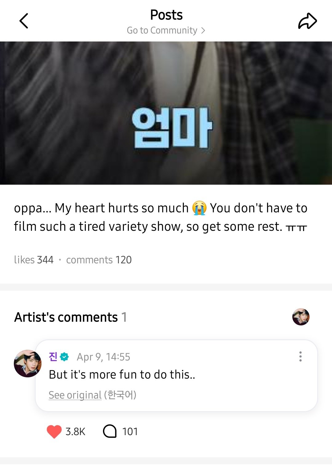 A fan on Weverse shared their concern for Jin and his schedules that: “Oppa… my heart hurts so much. You don’t have to film such exhausting variety shows, so please get some good rest. No matter what you do, I’ll support you. Please take care of yourself.”
