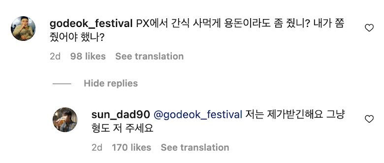 One time, fans suddenly discovered a "savage" conversation between him and his friend related to Jin. Specifically, below the comment section, Seok Jung's friend asked him if he had given "pocket money" to his younger brother. The person having the account name godeok_festival wrote: "Did you give him some pocket money so he can buy snacks at the PX? Should I have given him some?".
