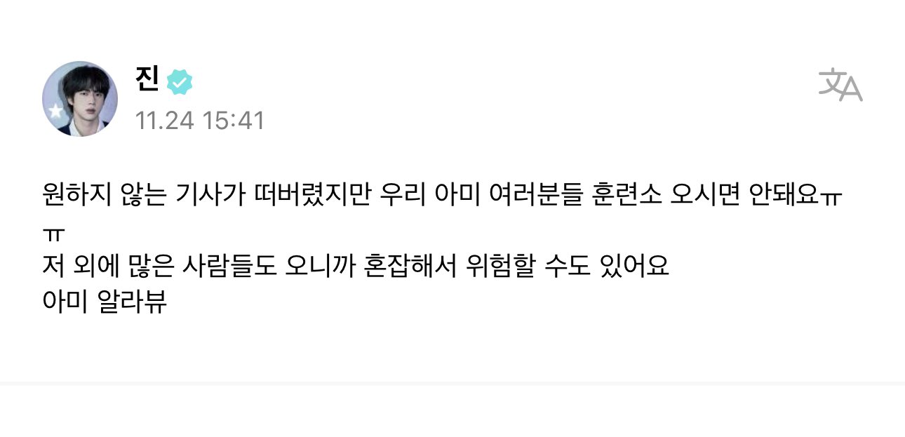 Jin shared in the post indirectly confirming the enlistment information that: "An article I didn't want went up but our ARMYs, you can't come to the training camp ㅠㅠ A lot of people other than me will come and it will be chaotic and it could be dangerous. ARMY allabyu (i love you)"