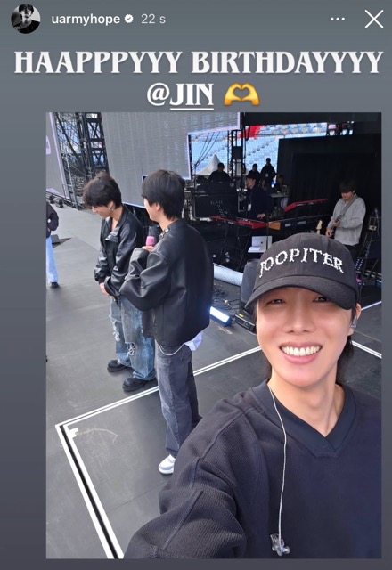 Aside from the stories Jin shared, several BTS members were also active on Instagram to wish him a happy 33rd birthday. Early in the morning, j-hope celebrated Jin by posting a rehearsal photo he took with Jin and Jungkook while preparing for the concert.